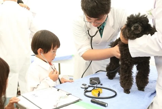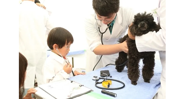 毎年、お子様に大人気のコーナーです。獣医学生と一緒に白衣を着て、聴診器で犬の心音を聞く等、獣医師のお仕事を体験することができます。
